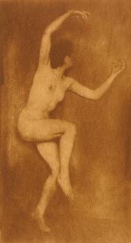 Naked woman sitting three-quarters back, on a chair, face in profile left