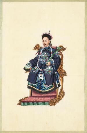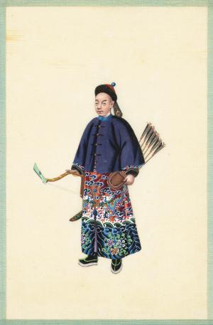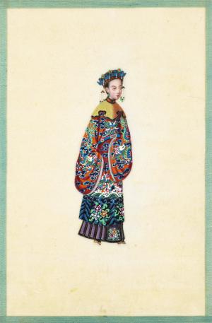 Page d'un album de peinture d’exportation figurant des personnages chinois