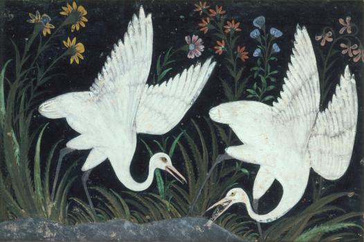 Deux grues au bord d'un étang