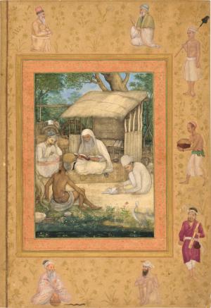 Saint homme et ses disciples étudiant un texte sacré