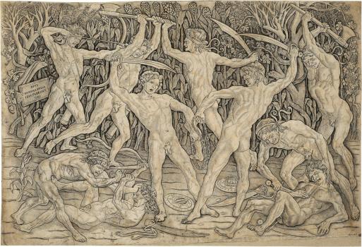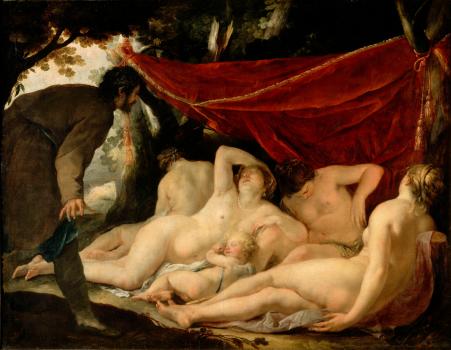 Femme nue, de dos, avec une queue de paon, la tête de profil à droite